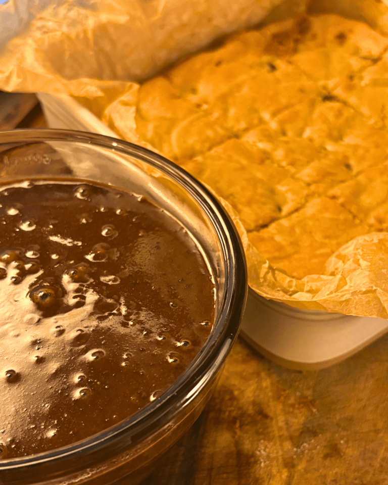 The brownies had cooled while we lingered at the dinner table. I left them on the counter while we ate, and I’m so glad I did. They settled just enough to hold their shape, with edges that stayed soft and centers that stayed gooey. When dessert time rolled around, we didn’t need plates. Just forks and that sauce.