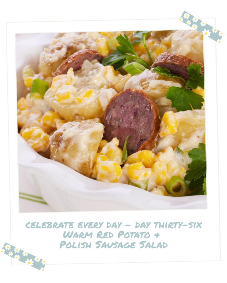 While the potatoes are steaming, slice 1 package of Polish sausage into bite-sized pieces and brown them in a skillet over medium heat. Set aside to cool slightly. - Make the dressing: