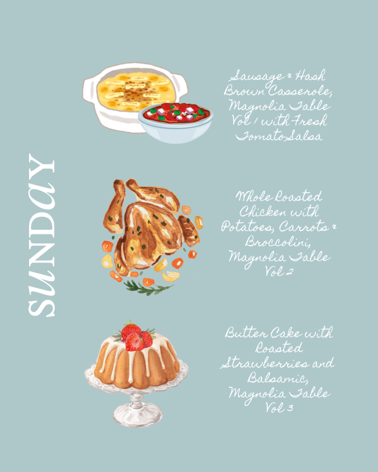 For Brunch: sausage and hash brown casserole from Magnolia Table Vol. 1 topped with fresh tomato salsa. For Dessert: a butter cake with roasted strawberries and a balsamic drizzle from Vol. 3.