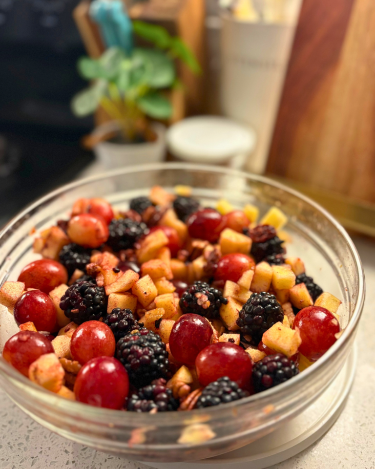 Breakfast will be leftover three-cheese quiche from Magnolia Table Vol. 1, still golden and tender, paired with the fall fruit salad that held up beautifully overnight. Cold fruit, warm quiche; it’s a perfect Monday combination.